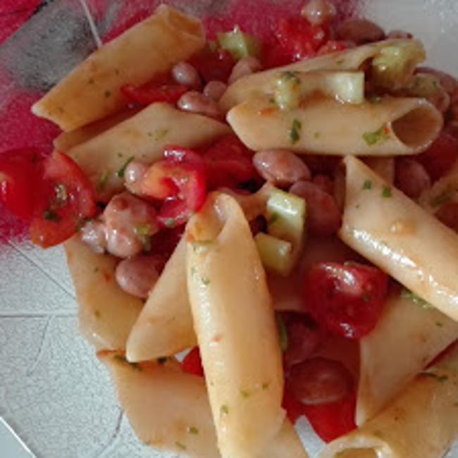 Cuocere i fagioli freschi in acqua bollente, con aglio, salvia, sedano. Una volta cotta, scolarli e metterli da parte (200g). Cuocere intanto la pasta. Nel frattempo tagliare a pezzi piccoli i pomodorini, il sedano e tritare il prezzemolo. Condire la pasta con fagioli, pomodorini, sedano, prezzemolo e aggiungere il pesto di pomodori secchi, olio evo e aggiustare di sale.
