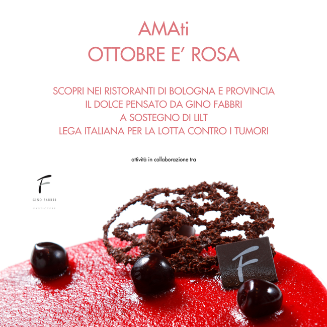 Confcommercio Bologna ha deciso di sostenere questa importante campagna e sensibilizzare il pubblico con un’attività che unisce il cibo, i dolci e il territorio: l’associazione ha coinvolto Gino Fabbri affinché creasse un dessert dedicato al mese rosa da poter gustare nei ristoranti di Bologna e provincia che devolveranno poi l’incasso della vendita dei dolci a LILT Bologna, Lega Italiana per la Lotta contro i Tumori.