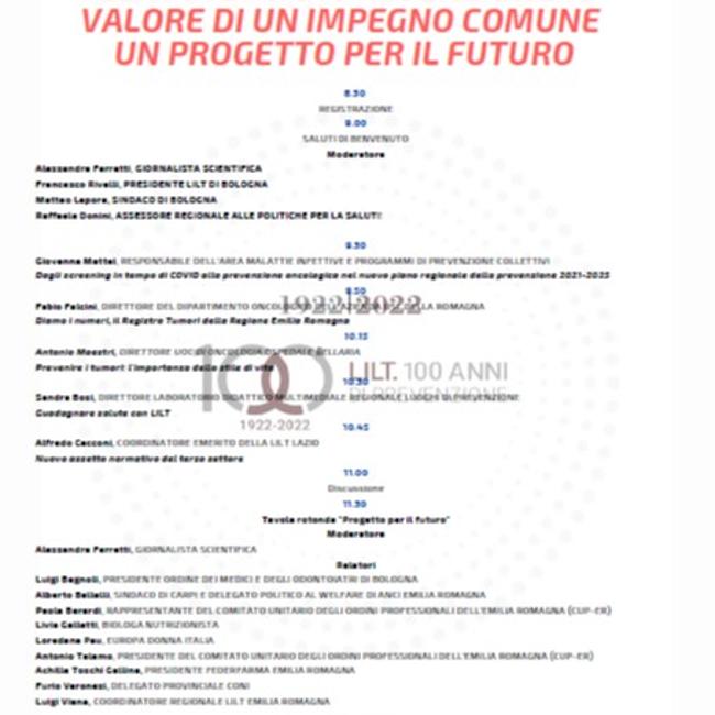 Prevenzione, reti, innovazione, comunità d’intenti. La Lega Italiana per la Lotta contro i Tumori compie 100 anni e a Bologna, dove di fatto nacque il 25 febbraio 1922, fa il punto sui traguardi raggiunti e su quelli ancora da tagliare. Il convegno, organizzato dal Comitato Regionale della LILT in collaborazione con la Regione Emilia – Romagna ha trattato, tra gli altri, dei dati degli screening oncologici, dei numeri del Registro Tumori, del valore degli stili di vita, del progetto "Guadagnare salute della Lilt" nelle scuole e del nuovo assetto normativo del Terzo Settore. Ha chiuso il confronto una tavola rotonda con diversi esperti ispirata ad un patto comune per la diffusione della cultura della prevenzione.